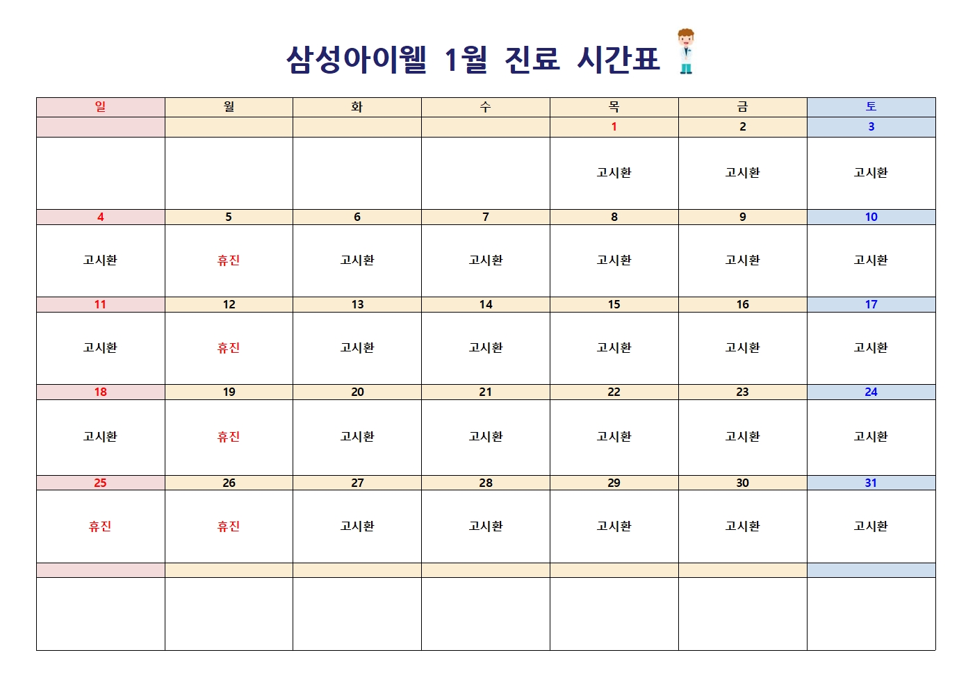 2026년 1월 진료시간표입니다. (1/19부터 진료시간 변경)